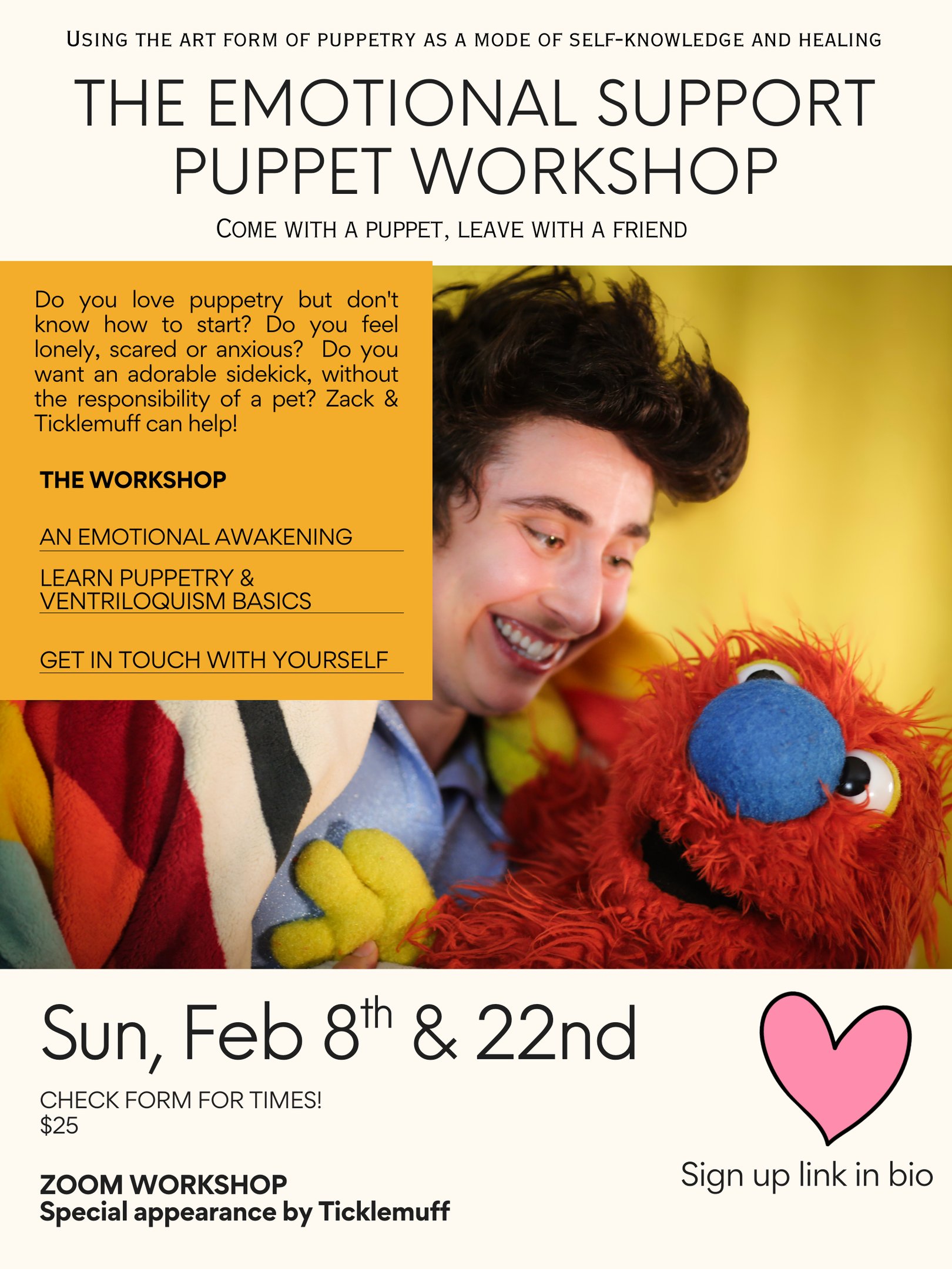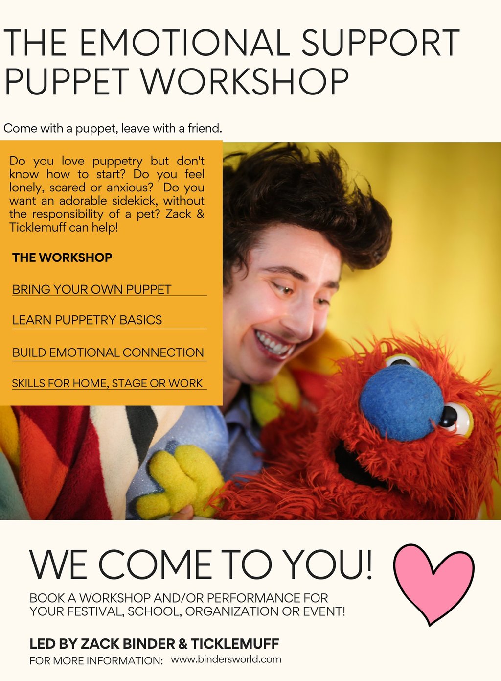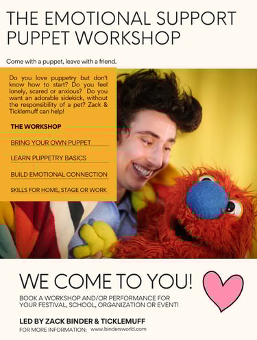 For anyone who's lonely, anxious, scared or has a passion for puppetry. This workshop is for anyone who wants to learn the basics of making a puppet come to life. Your goals beyond that may be to perform in public, incorporate it into your work, play at home with family and friends or connect more deeply to yourself.